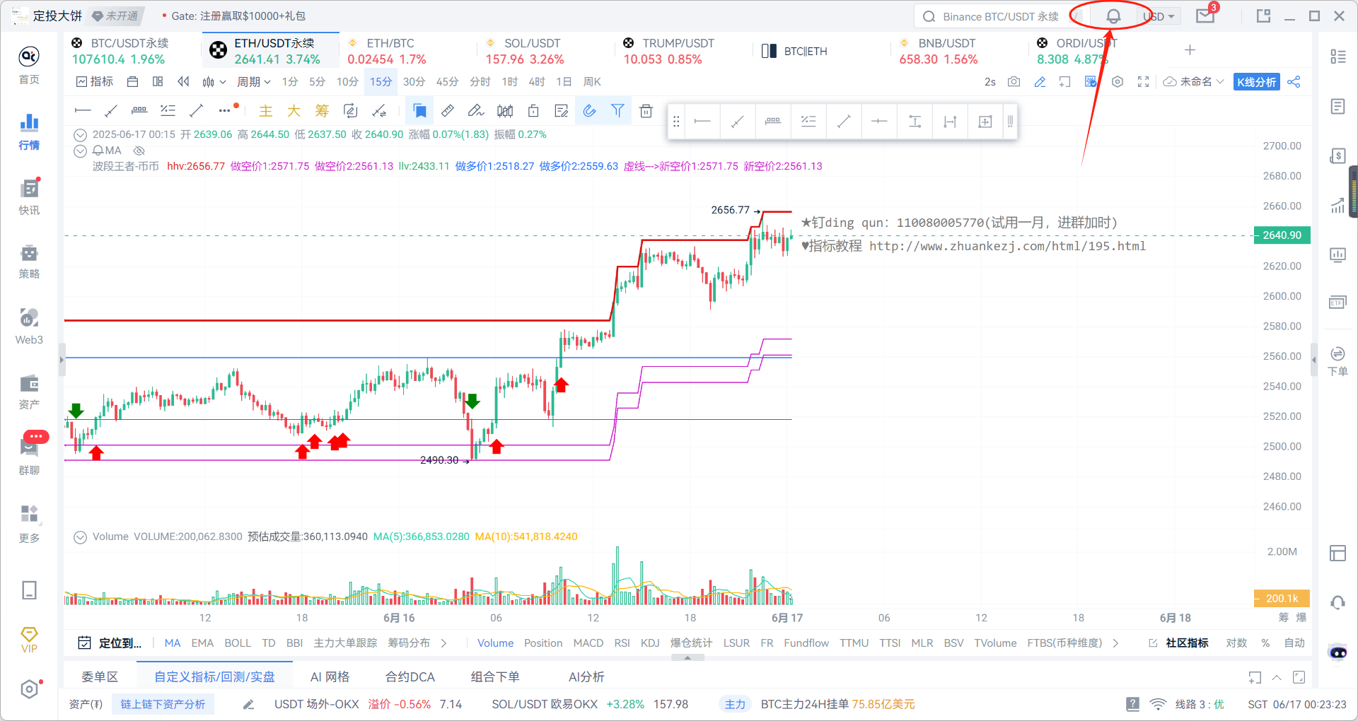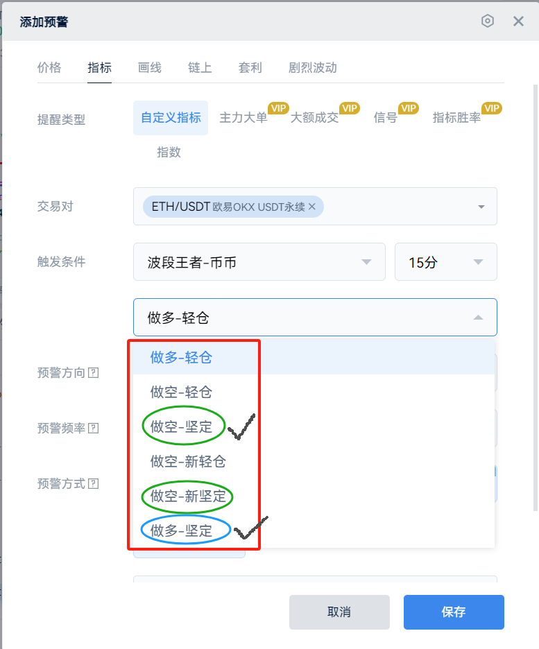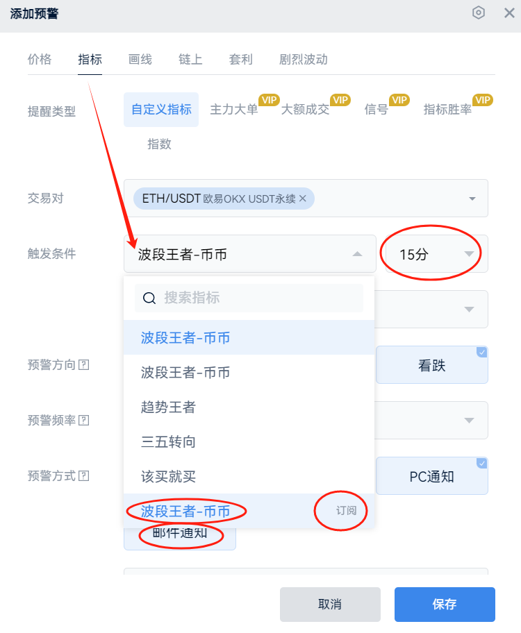 【触发条件】选择{波段王者-币币},时间选{15分},