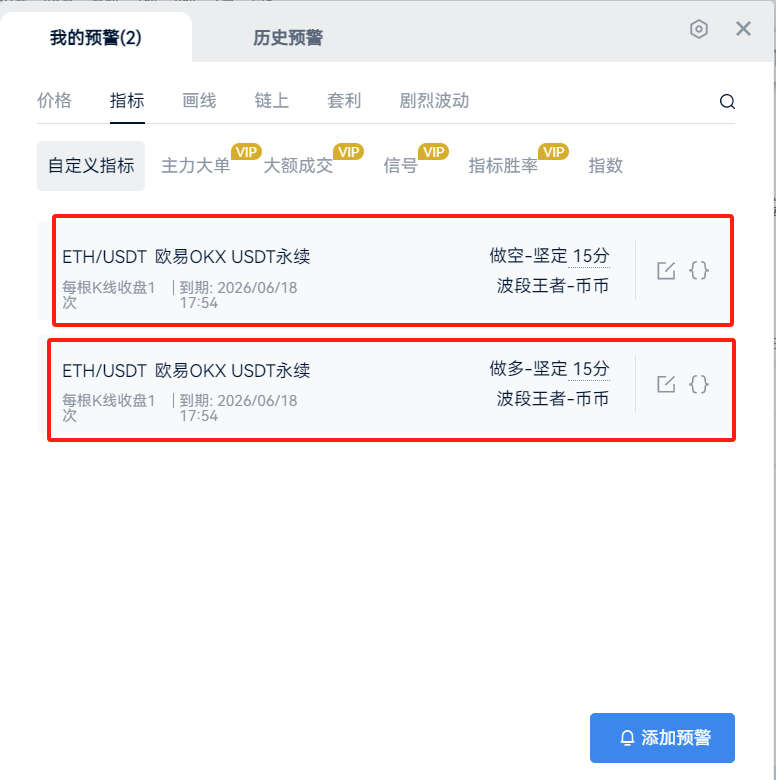 如果【波段王者-币币】有多个,那就选有6个预警选项的那一个